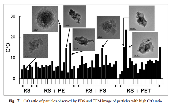 プラスチック混合燃焼によって生成された単一粒子は、高炭素質の高C/O比を示すことが判明。Single-particle analysis of mixed plastic combustion aerosols revealed frequent particles with a high C/O ratio